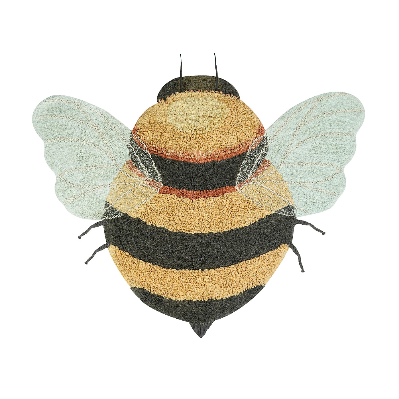 Tapete silhueta em forma de abelha, com corpo listrado nas cores Mel e Cinza escuro e asas em azul claro.
