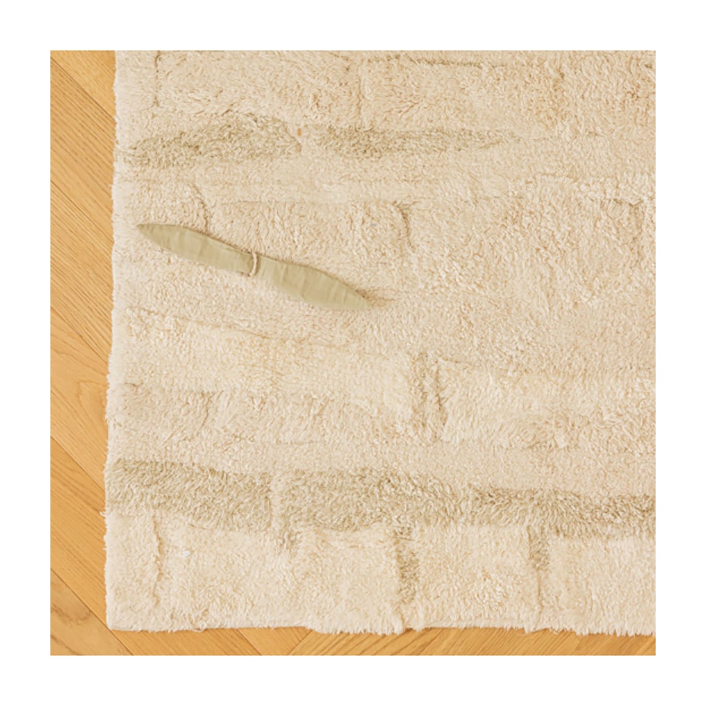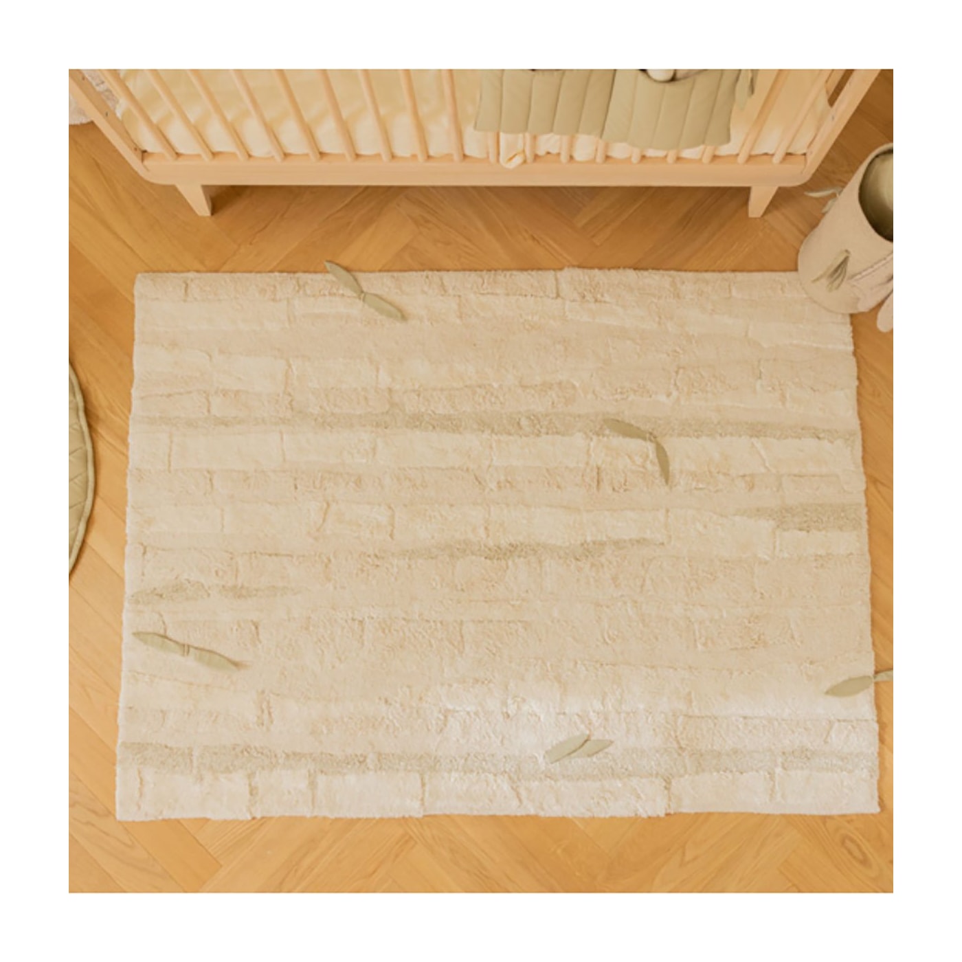 Reproduzindo uma floresta de canas de bambu, este tapete de algodão em tons suaves é delicadamente desenhado combinando algodão em tons de natural e verde-oliva com um fio de algodão macio misturado com raiom de bambu. As diferentes cores jogam com alturas diferentes para dar estrutura extra à superfície. Decorado com 5 peças de folhas de bambu removíveis em algodão orgânico.