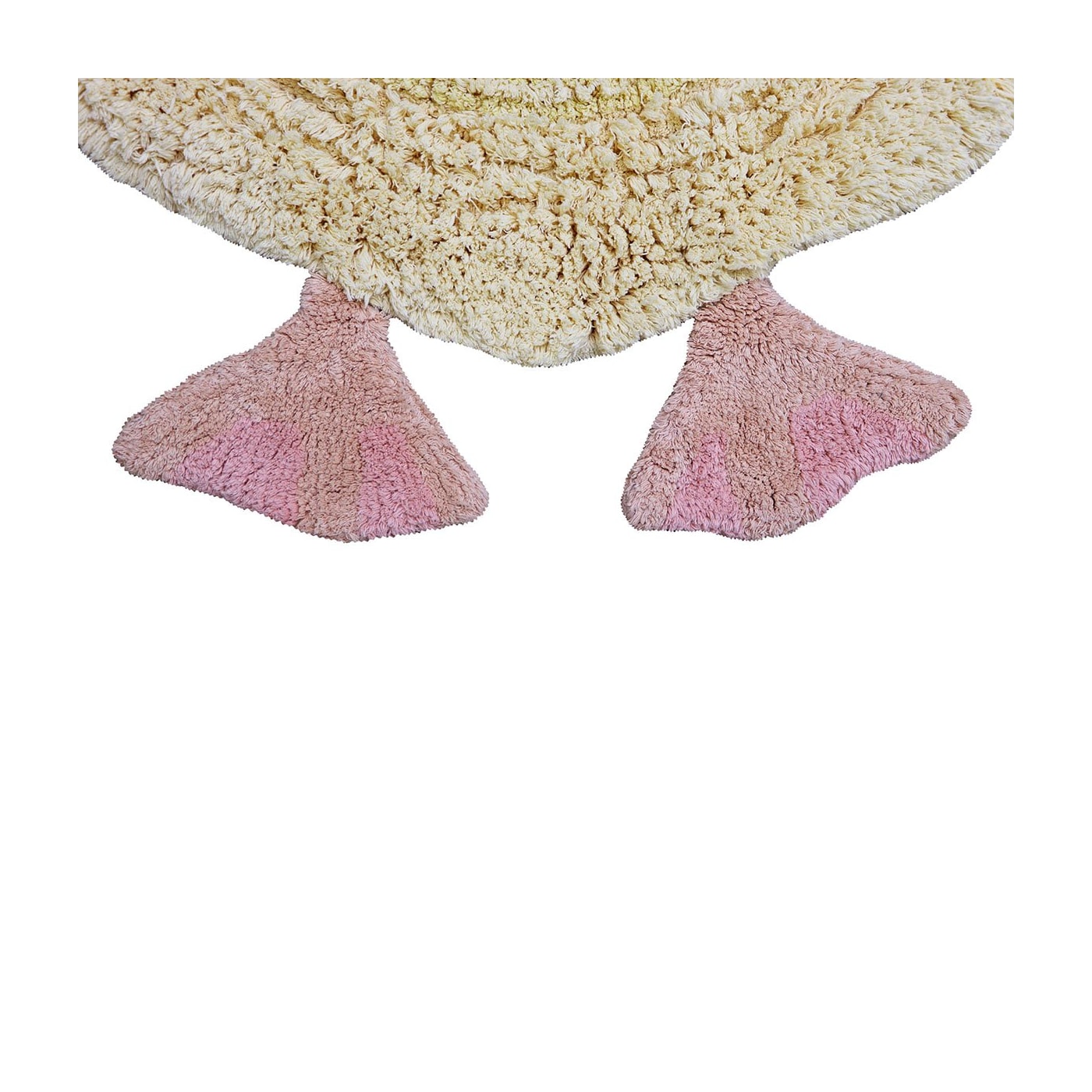 O tapete lavável Ducky tem um bico e patas cor de rosa com pelos fofos tanto na frente quanto no verso.