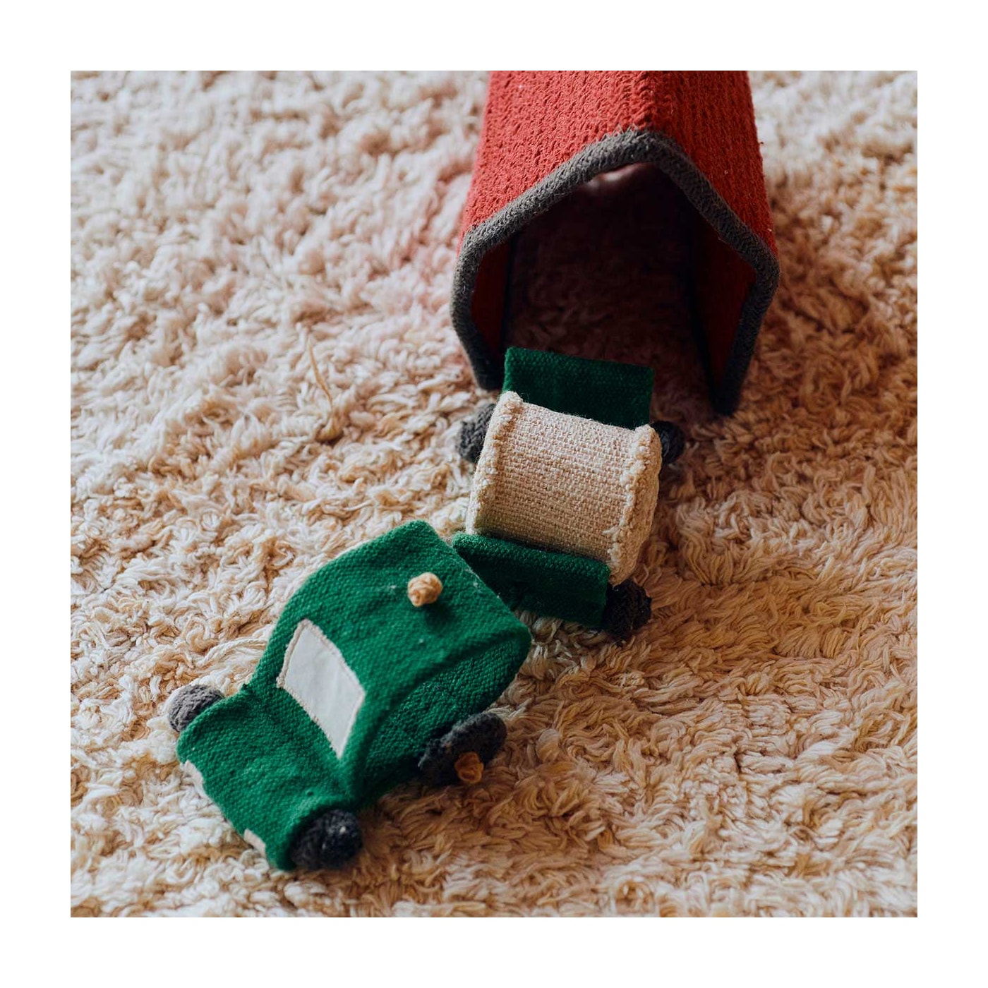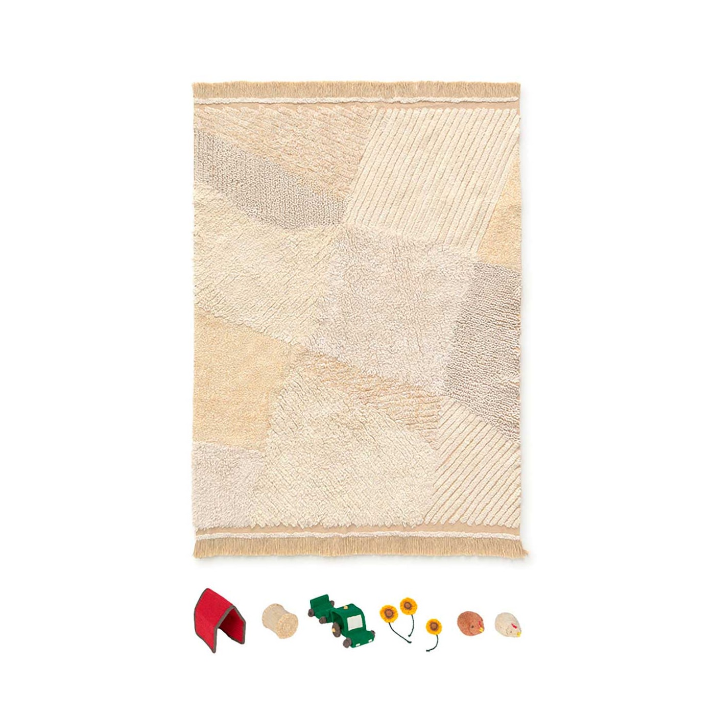Tapete de brincar retangular em cor natural com linhas em diferentes tons de cinza e bege, simulando um campo agrícola. O tapete vem com 7 acessórios: um mini celeiro, 2 mini girassóis, um mini caminhão, uma mini galinha e um mini palheiro.