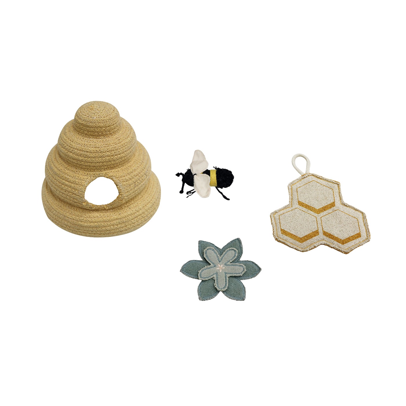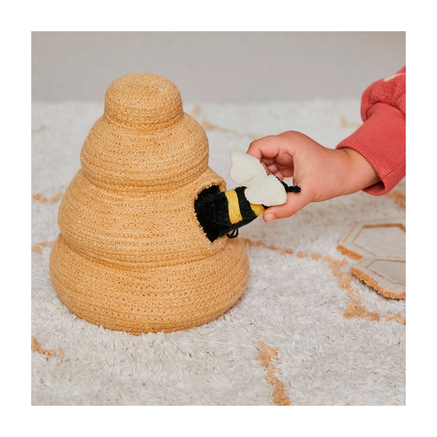 Acompanhe a abelha em sua jornada da flor à colmeia! Tapete retangular feito de algodão na cor Marfim e com um desenho inspirado em um labirinto na cor Mel Claro. O tapete tem acabamento nas bordas com tranças cor de mel, e vem acompanhado de quatro acessórios artesanais para brincar: uma colmeia cor de mel com cordões de algodão, uma flor em base canvas Blue Sage, um favo de mel em lona de algodão estampado e uma linda abelhinha totalmente feita à mão.