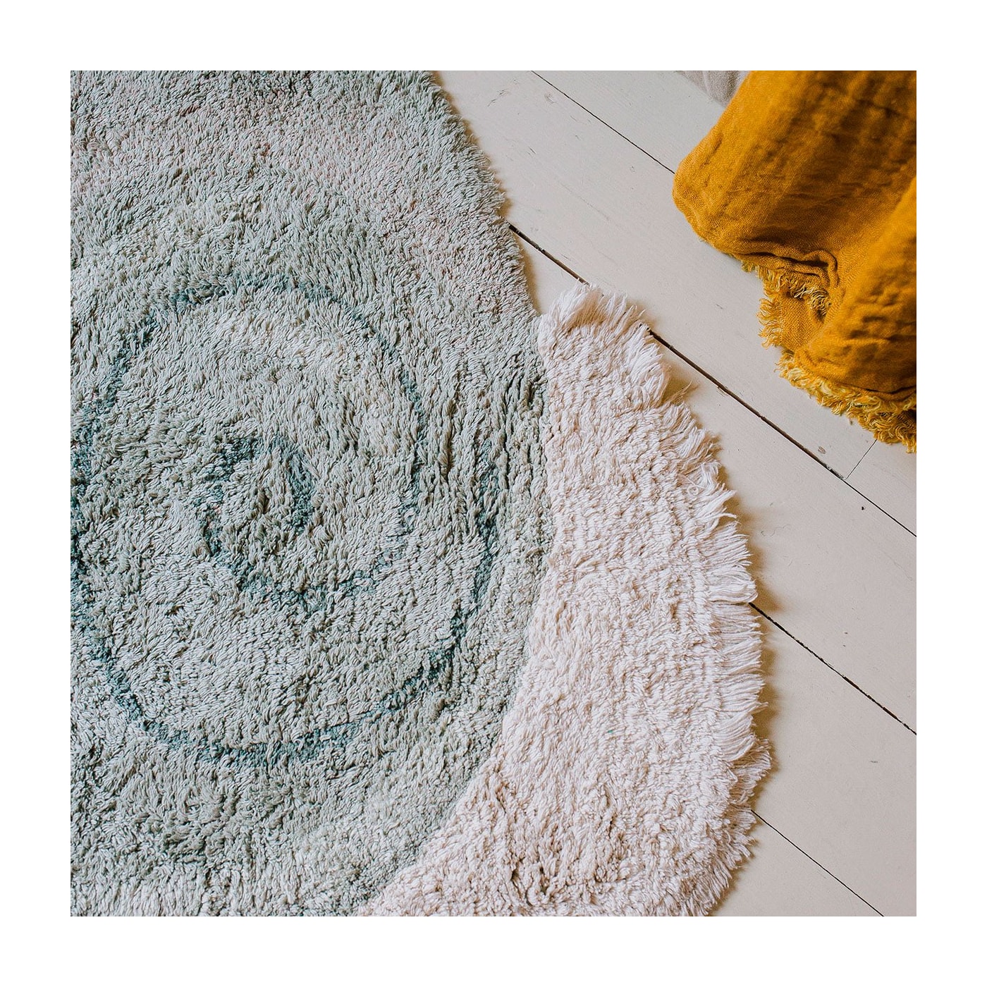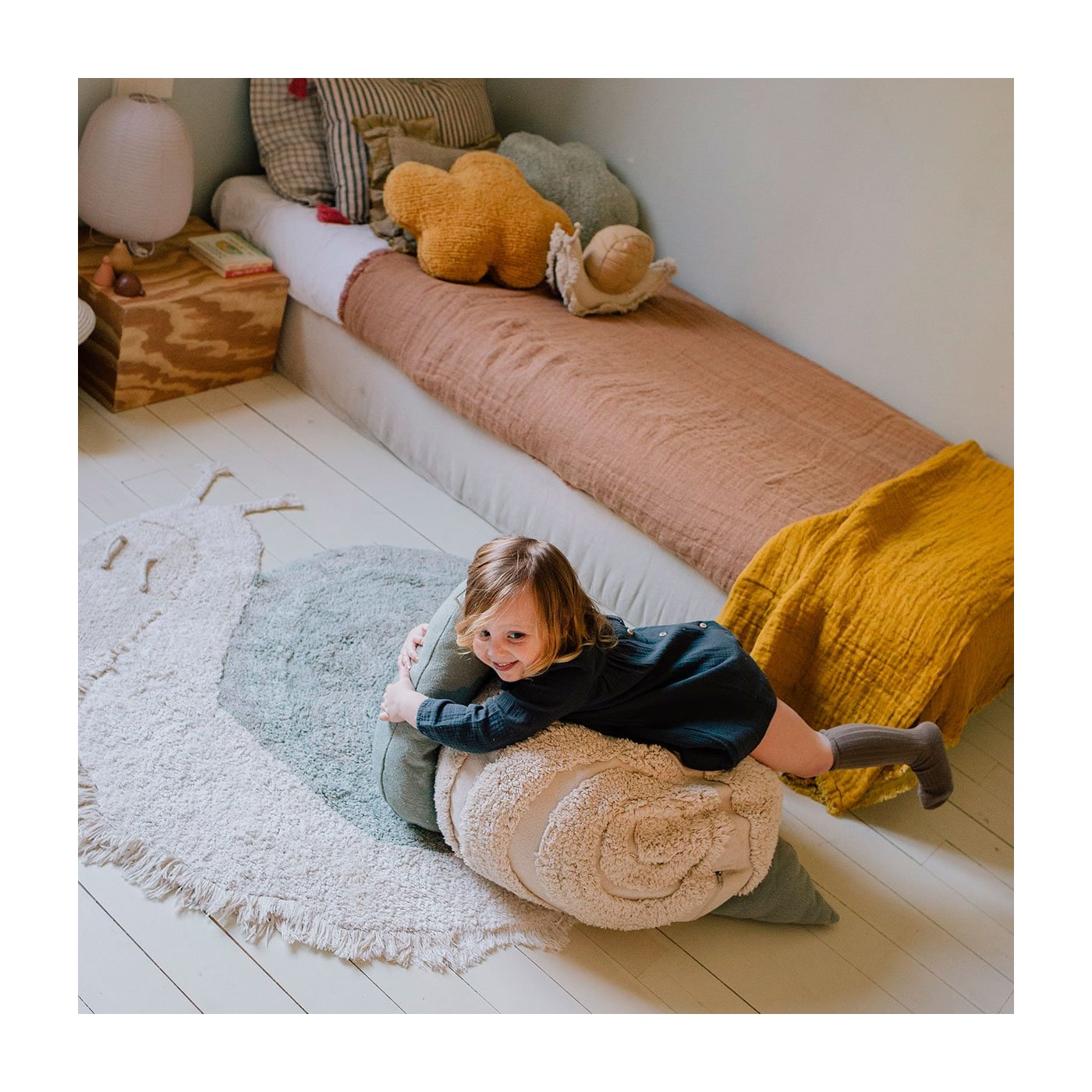 Se você já é fã do nosso pufe Mr. Snail e da nossa almofada Lazy Snail, estamos felizes em apresentar a você um novo membro da família! O tapete lavável Snail tem uma concha redonda em Salvia azul misturada com tons suaves de azul e verde, uma mistura de cores com pelo da mesma altura que recria realisticamente a espiral da concha do caracol.