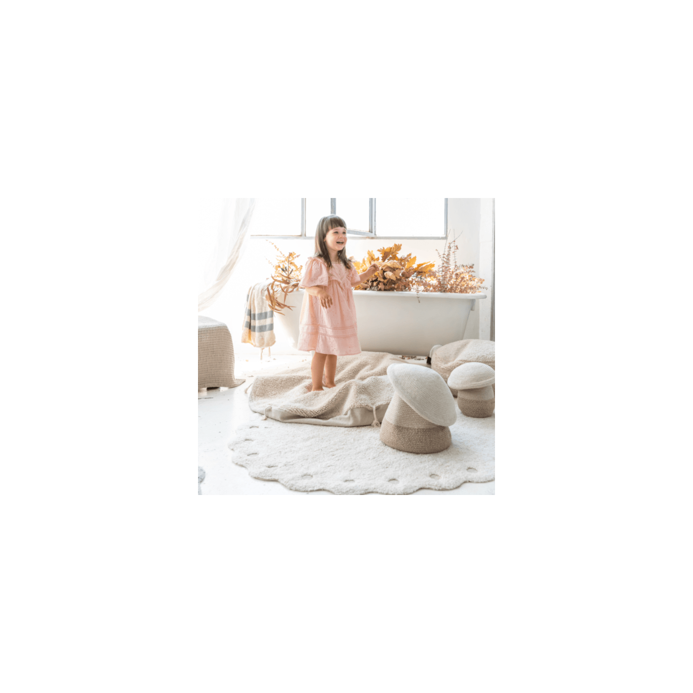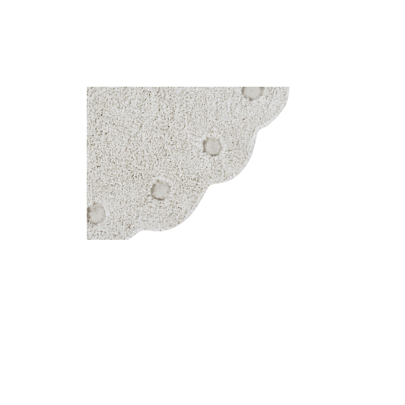 Com uma mistura de fios de cor Marfim e Natural, bordas arredondadas ao redor com bolinhas em baixo relevo aparentes, na cor da lona de algodão natural.