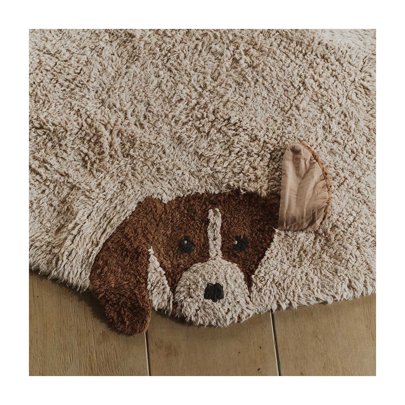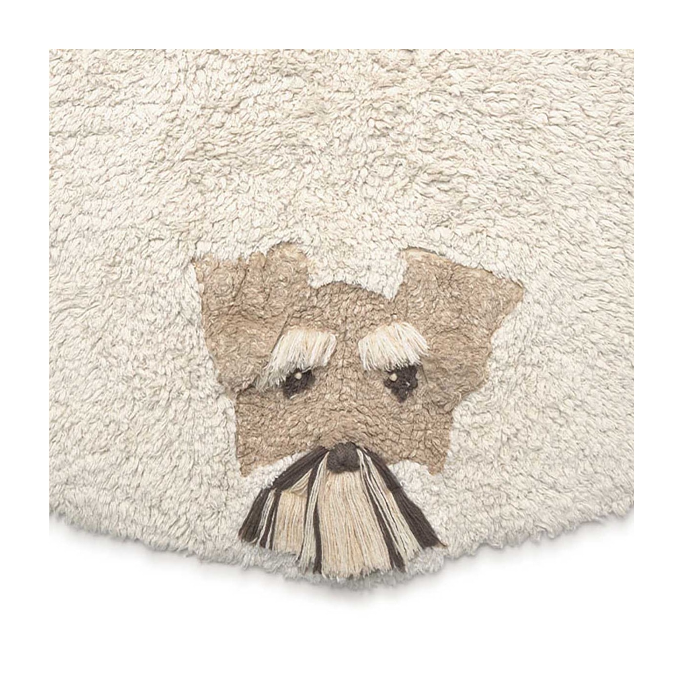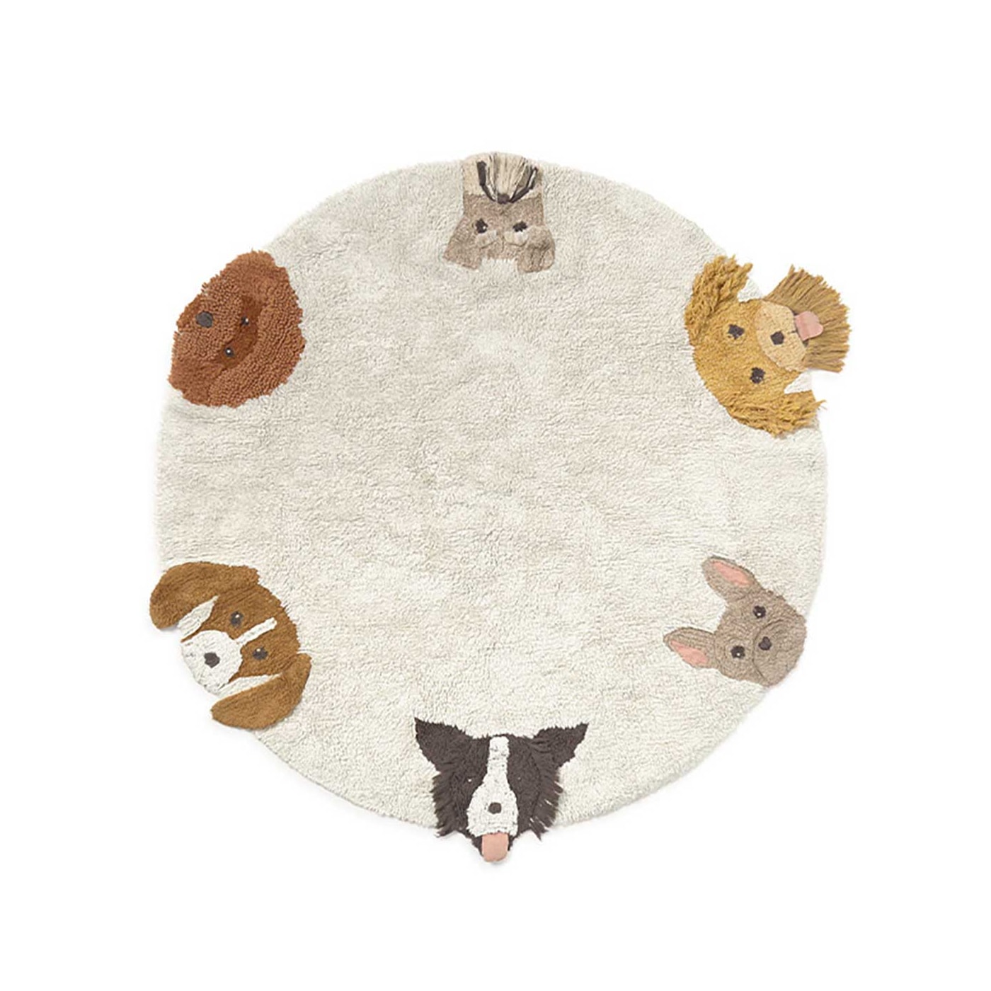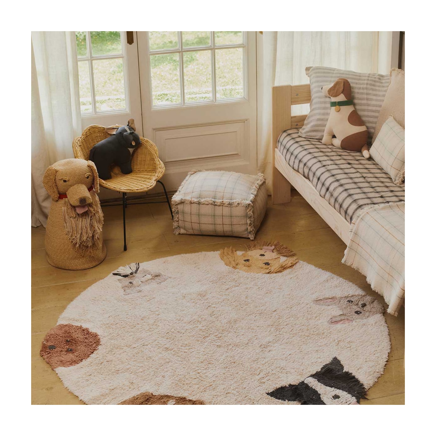 Tapete redondo em tom natural, ideal para quarto infantil, com os rostos de seis raças diferentes de cães. Cada carinha de cachorro é feita à mão, com detalhes incríveis como orelhas em 3D, línguas móveis, bigodes, barbas e olhos com nós que dão um toque realista e encantador.