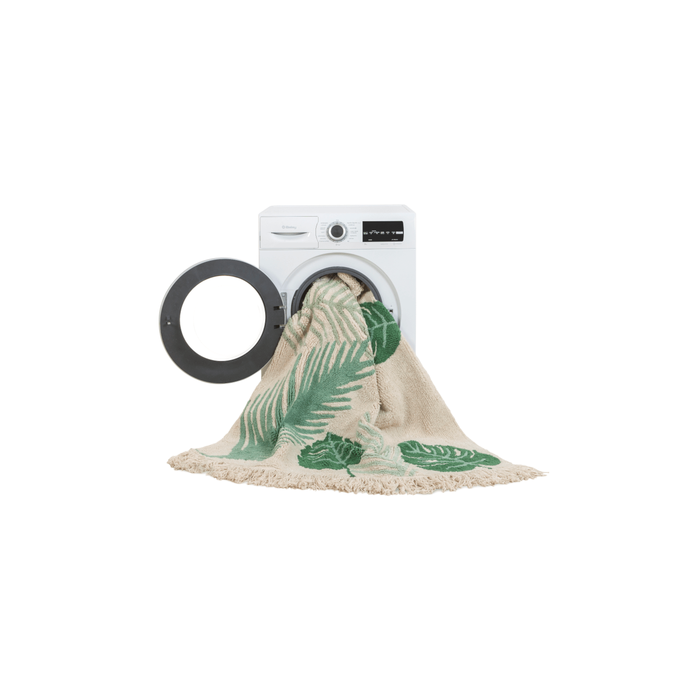 Tapete retangular com base algodão natural e desenhos de plantas em tons de verde. Franjas na extremidade.
