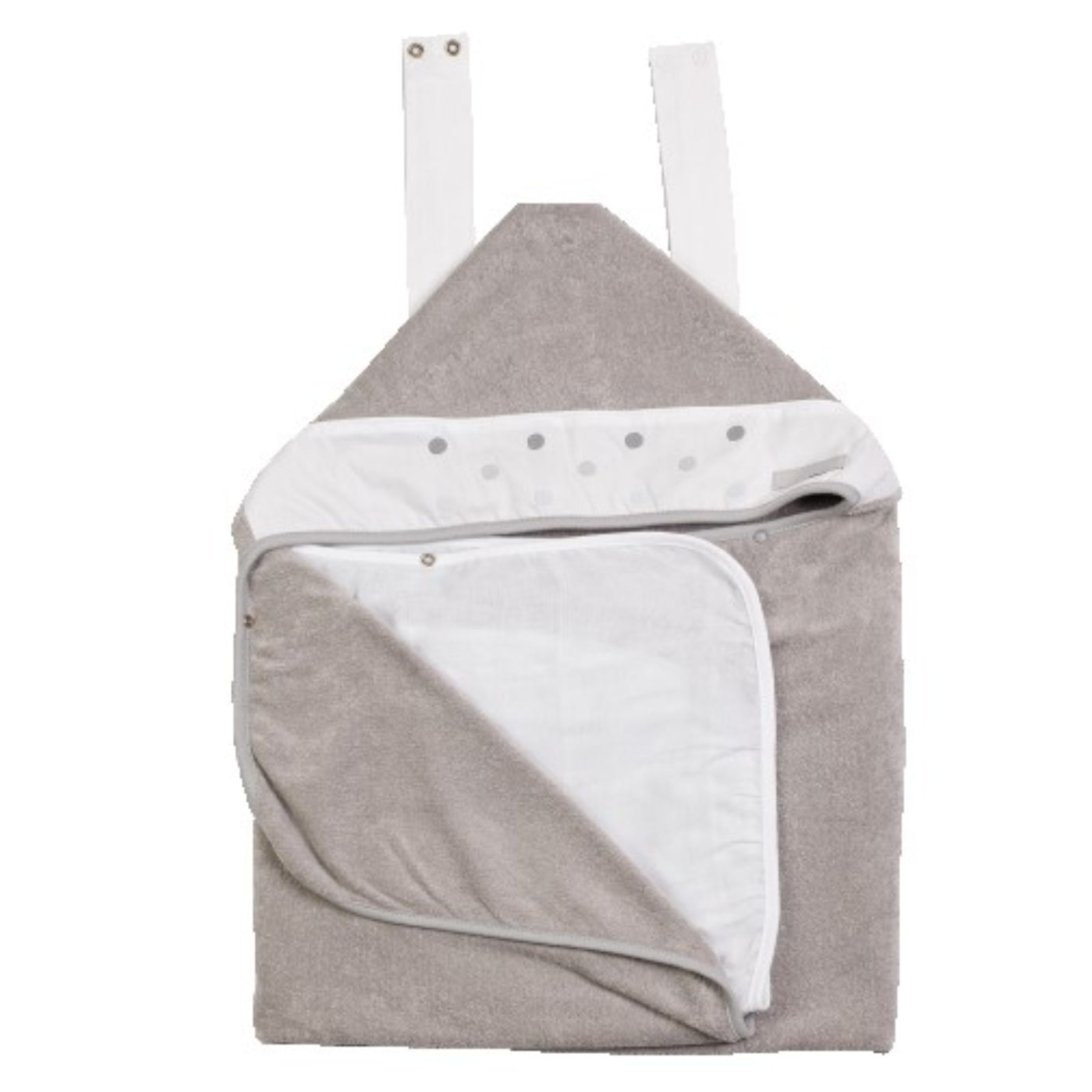Toalha Multifuncional com malha atoalhada dupla e com fralda solta presa com botão. Alças para pendurar no pescoço com botões para soltar.