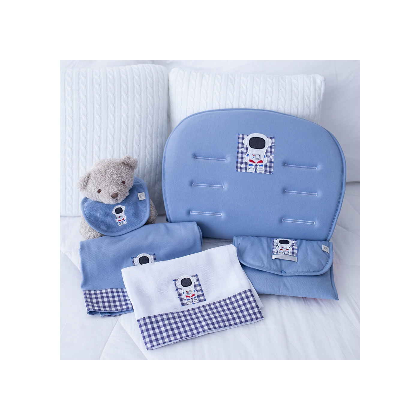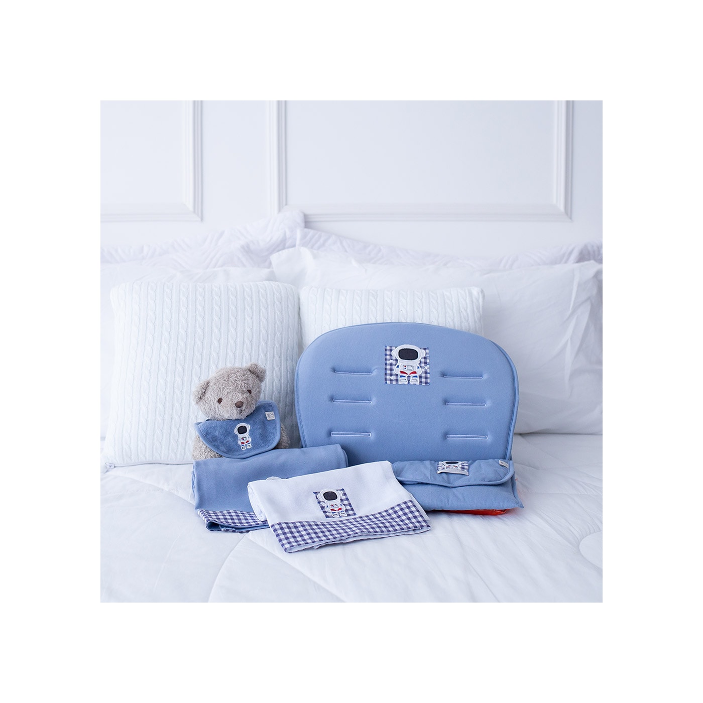 Toalha Multifuncional com malha atoalhada dupla e com fralda solta presa com botão. Alças para pendurar no pescoço com botões para soltar.