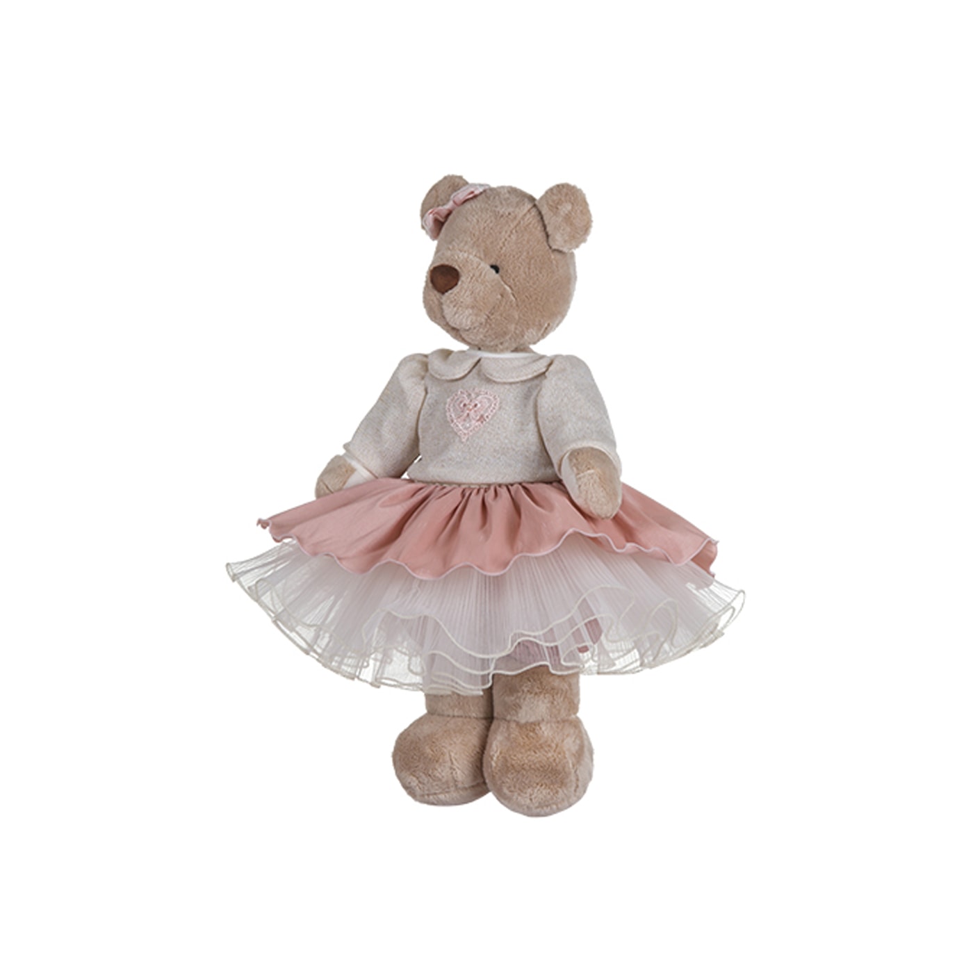 Uma linda ursa Kikinha muito querida por suas cores suaves e que se encaixa a vários ambientes. Blusa em tricot com leve brilho em dourado e saia em tule, se torna perfeita para decorar e encantar as mais lindas decorações de festas infantis ou decoração de quarto do bebê. Junto com Bob Gummy bege faz um casal apaixonado para encantar o quarto de bebê ou a foto de newborn. De fácil Higienização.