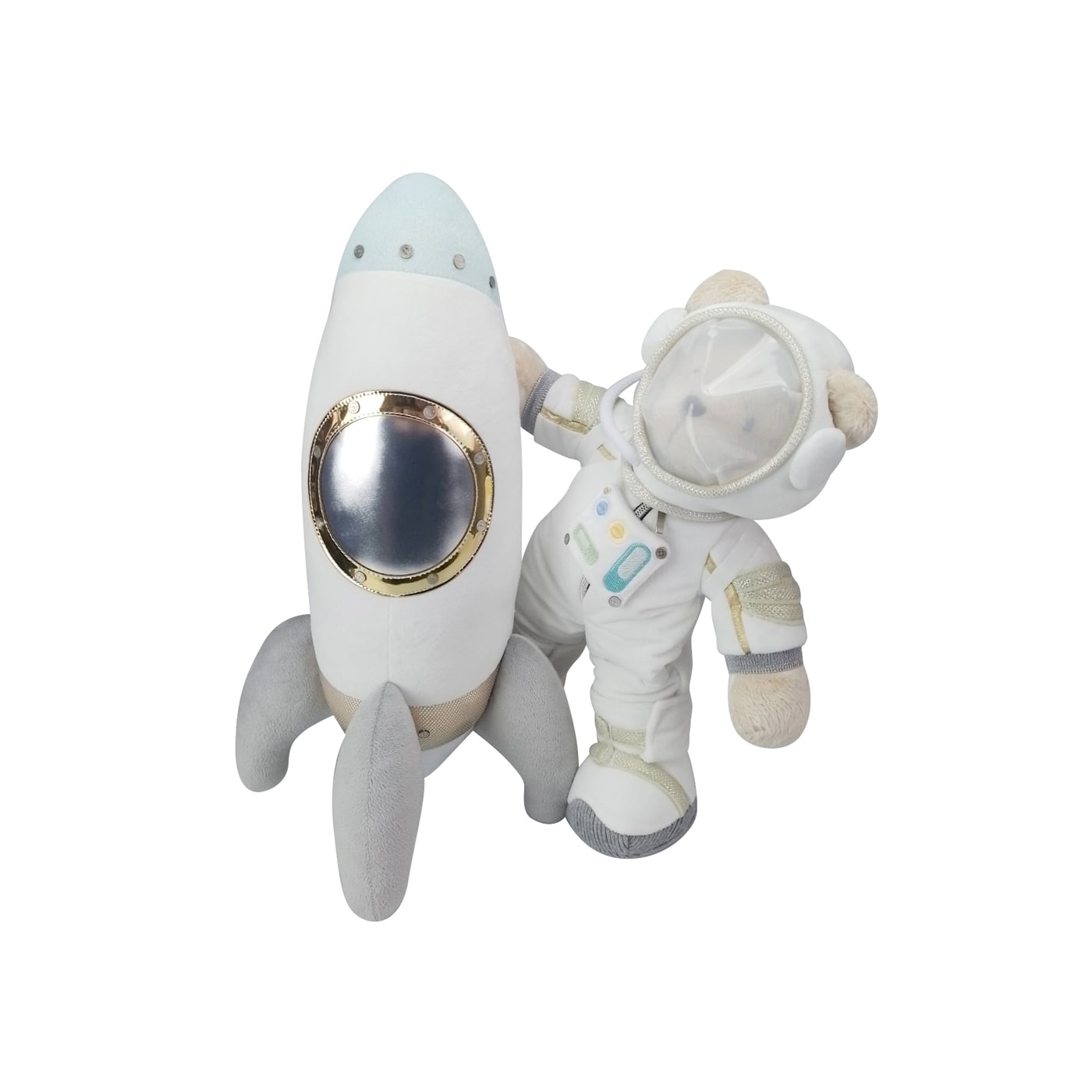 Nosso ursinho astronauta segurando no foguete é perfeito para decorar quartos infantis ou as mais divertidas festas infantis. Confeccionado com tecido super fofo e macio ao toque com detalhes cheios de brilhinhos e bordados. Produto desenvolvido de acordo com as normas técnicas brasileiras e acreditado pelos órgãos responsáveis, garantindo um produto seguro para todas as crianças a partir de 3 meses.
